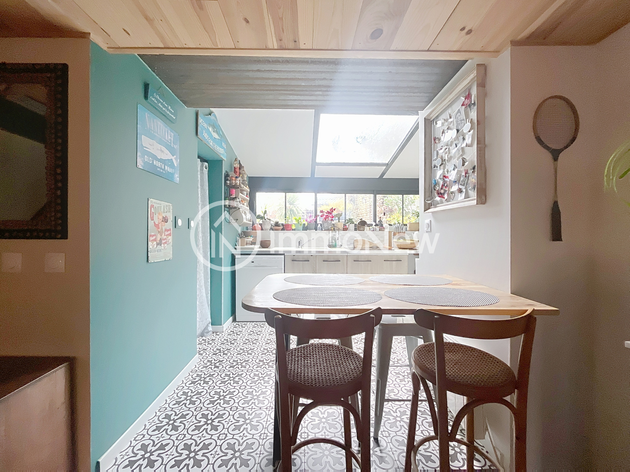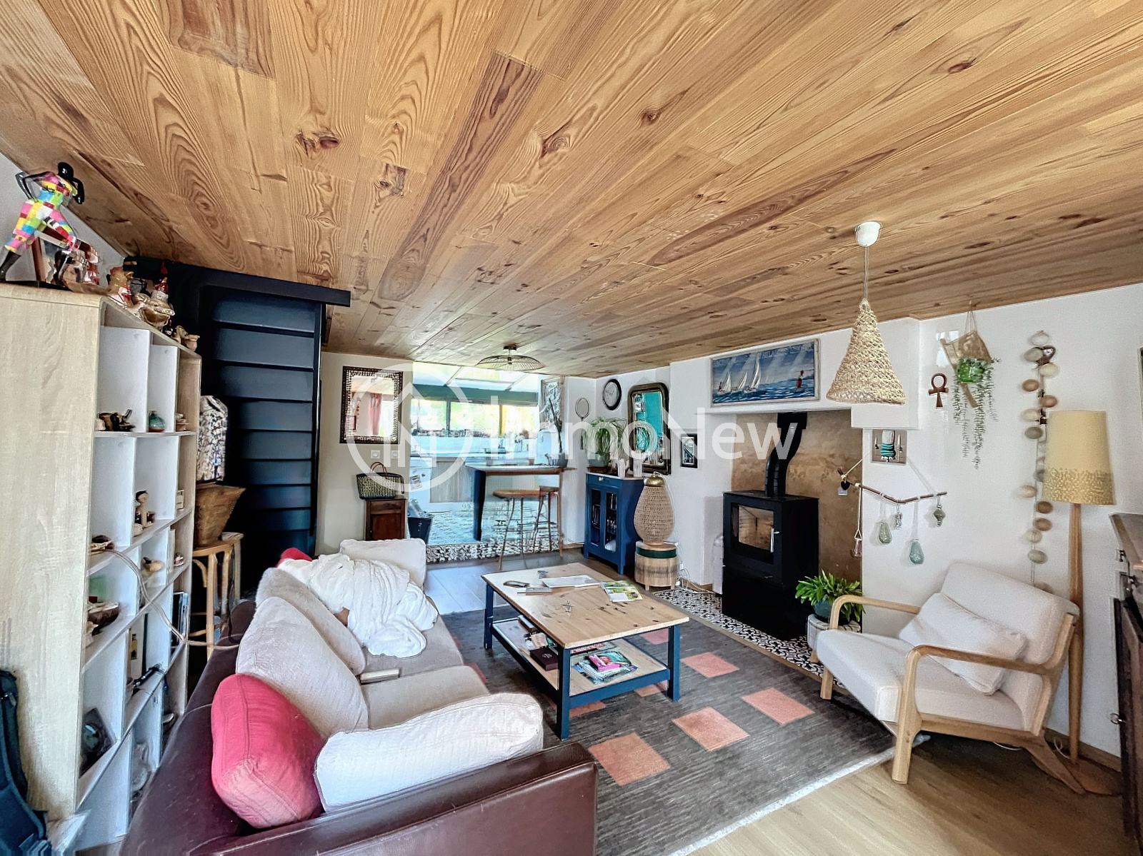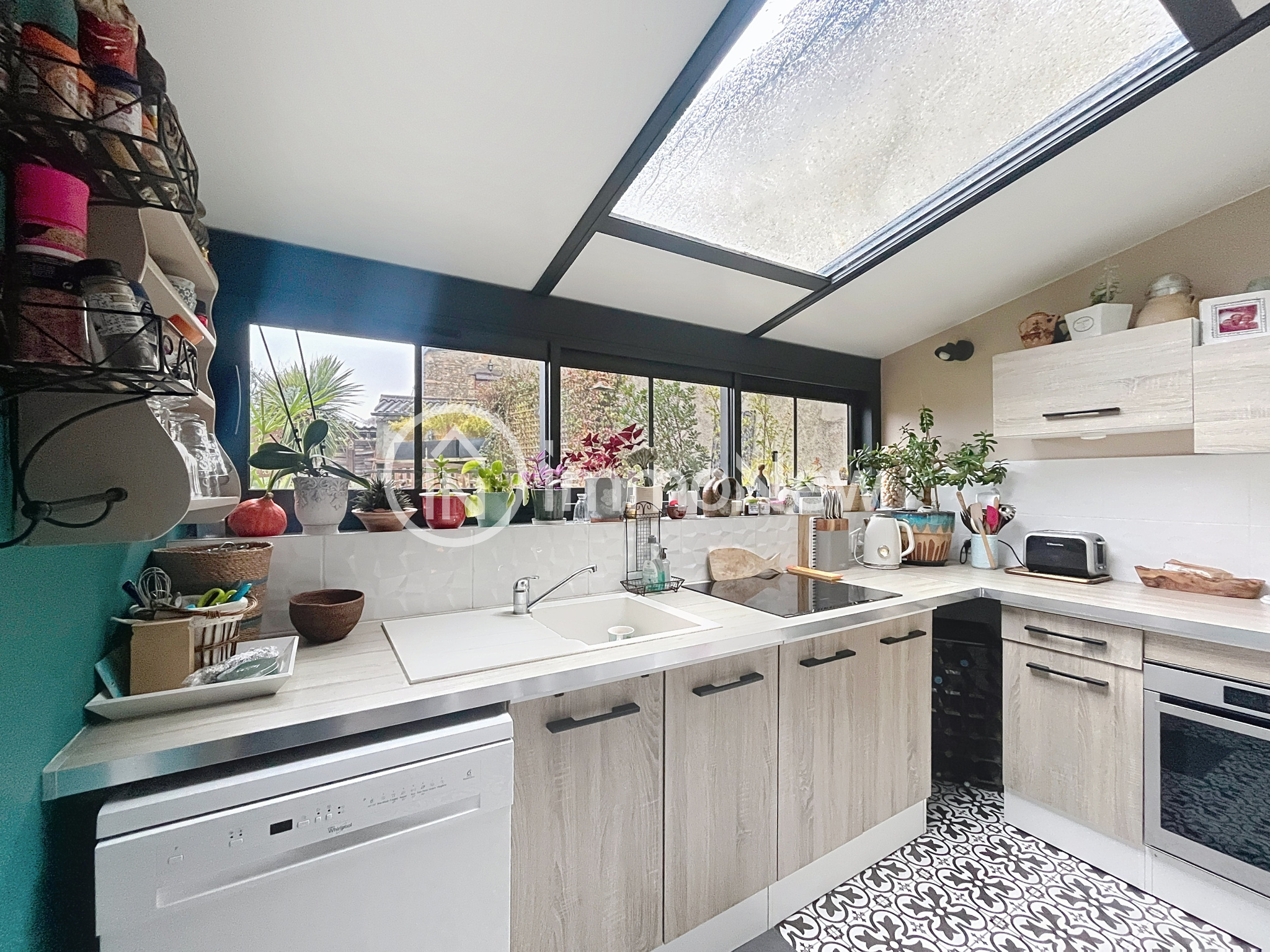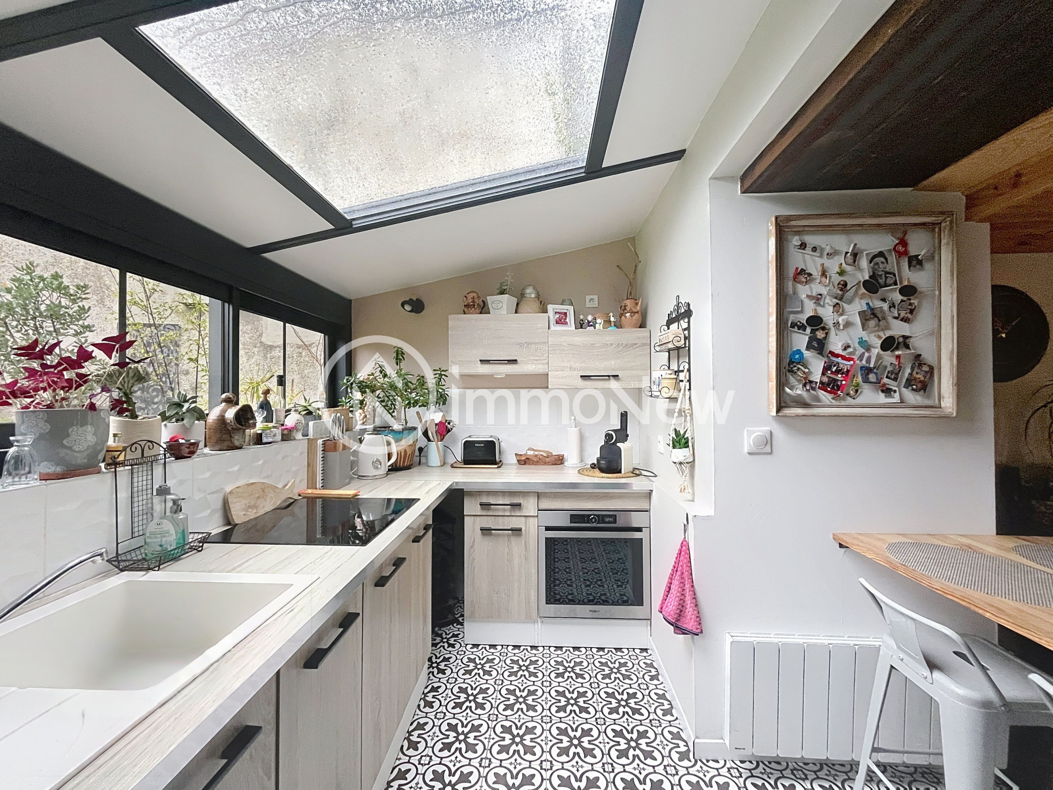 au rez-de-chaussée : un séjour/salon avec poele à bois, une cuisine aménagée et équipée ouverte avec verrière, un dégagement/arrière cuisine.