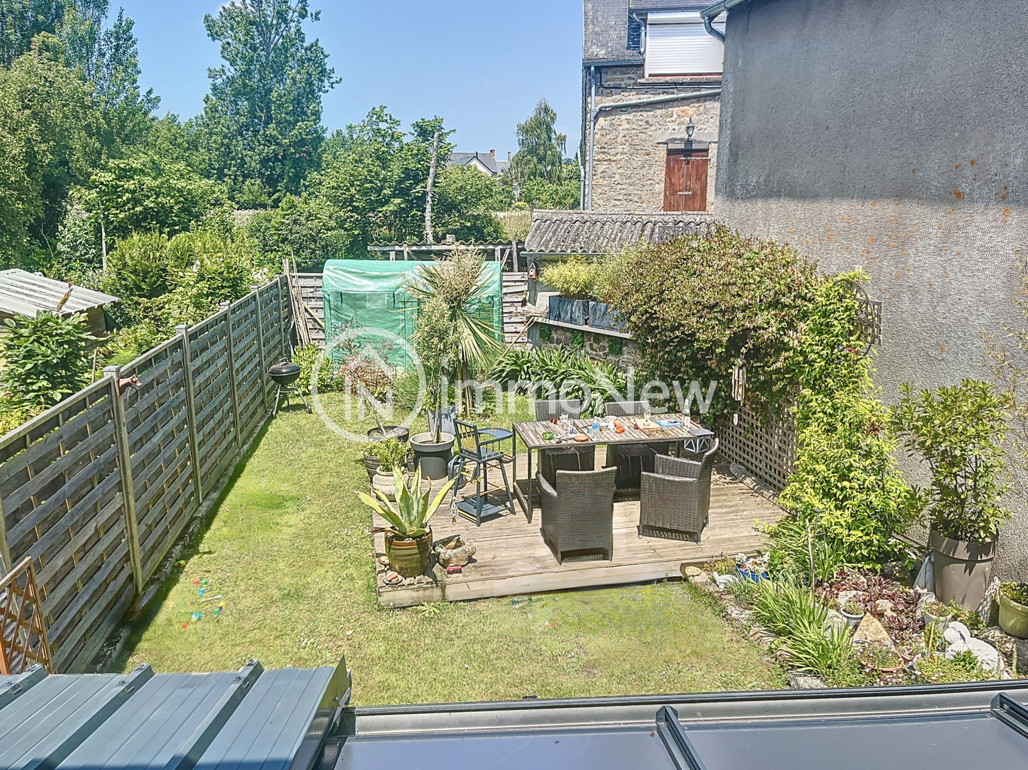 un garage mitoyen avec espace buanderie, une terrasse, un jardinet devant un un jardin clos derrière.