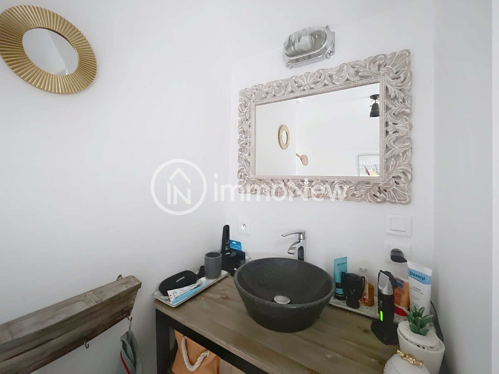 au rez-de-chaussée : une cuisine aménagée et équipée ouverte sur un séjour et une pièce avec douche et wc.