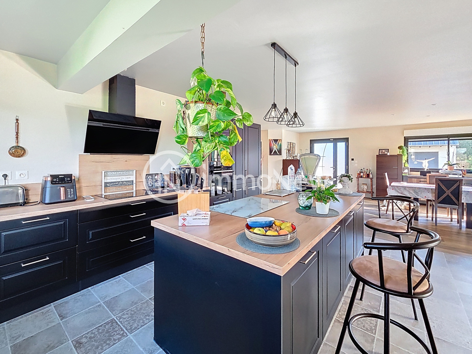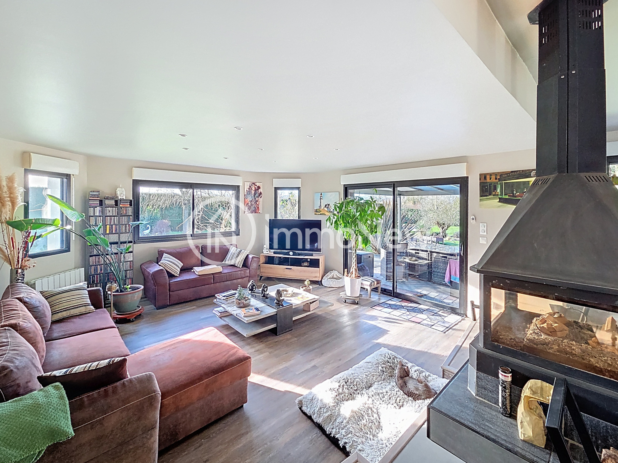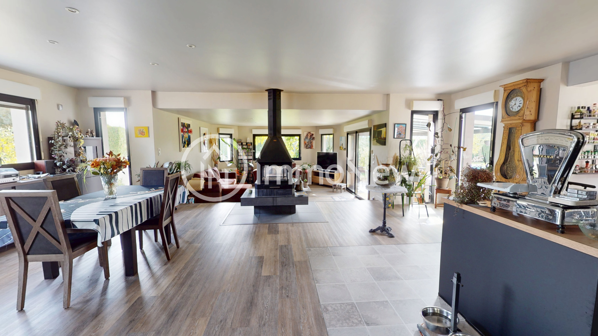 Elle se compose d'une vaste pièce de vie de plus de 80m² avec cuisine de qualité aménagée et équipée, l'espace salle à manger ainsi que le coin salon avec un poele à bois central.