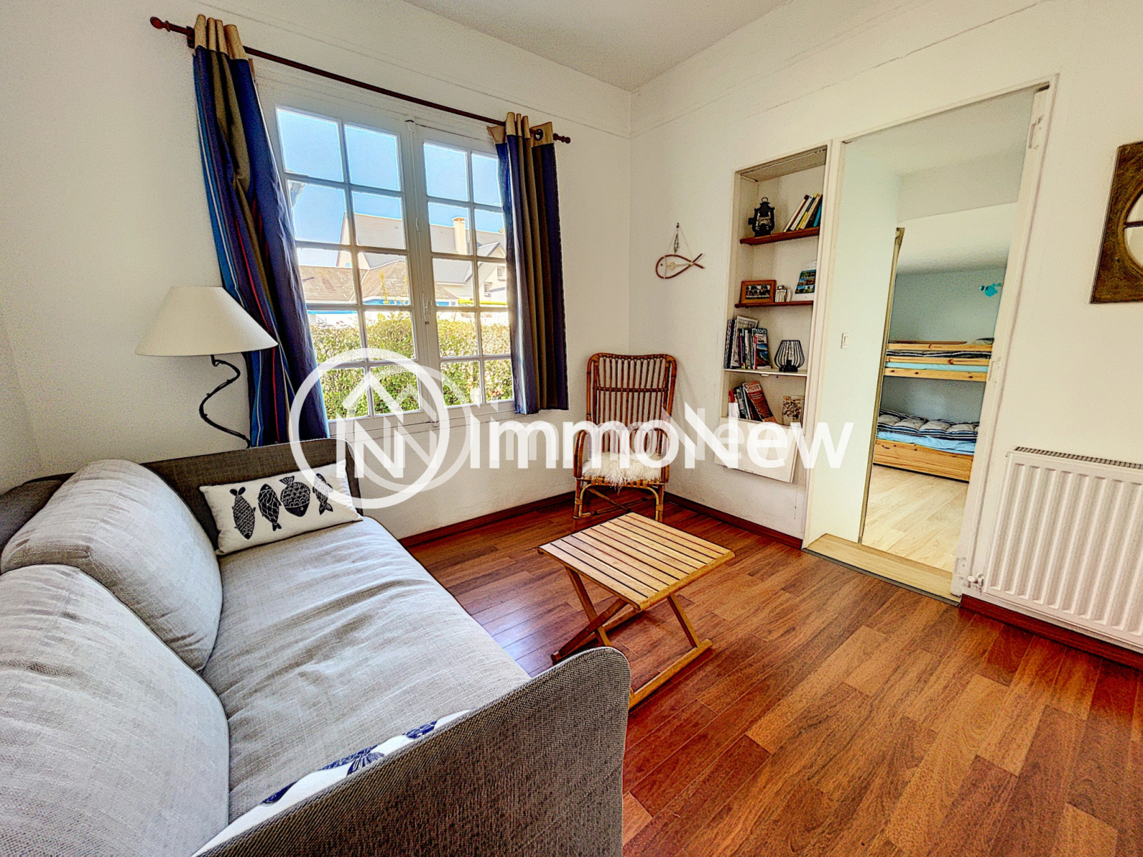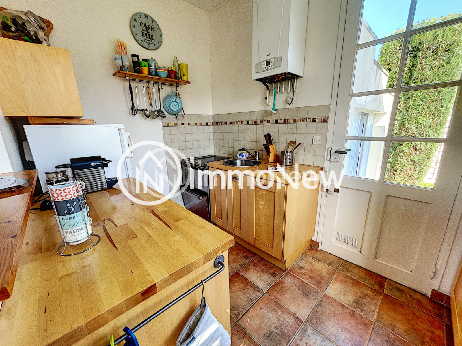 Jullouville (50610)Immonew vous présente en exclusivité cette maison orientée au sud, idéalement située au calme, à 400 mètres de la plage et des commerces, de plain pied construite en parpaings et couverte en ardoises composée de: cuisine ouverte sur salle à manger, salon, 2 chambres, 2 salles d'eau avec wc. Garage, appenti. Jardin autour. Parcelle de 318 m2
