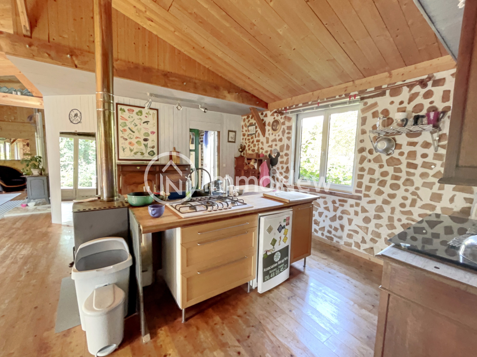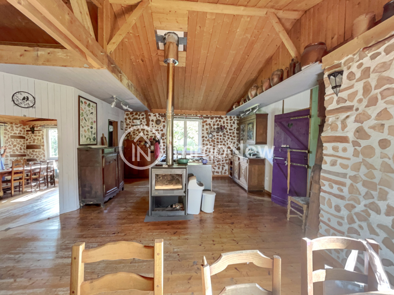 Une cuisine ouverte sur un séjour/salon avec deux poêles à bois, trois chambres, une salle d'eau et un wc sec.