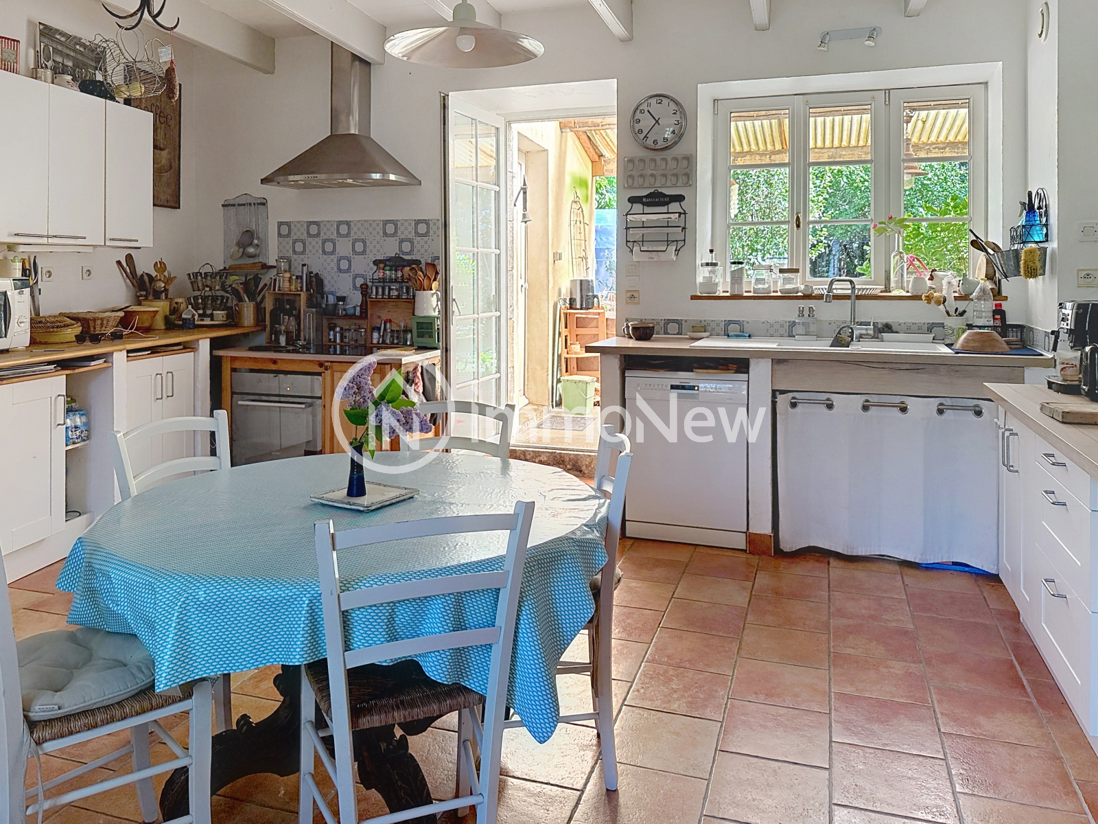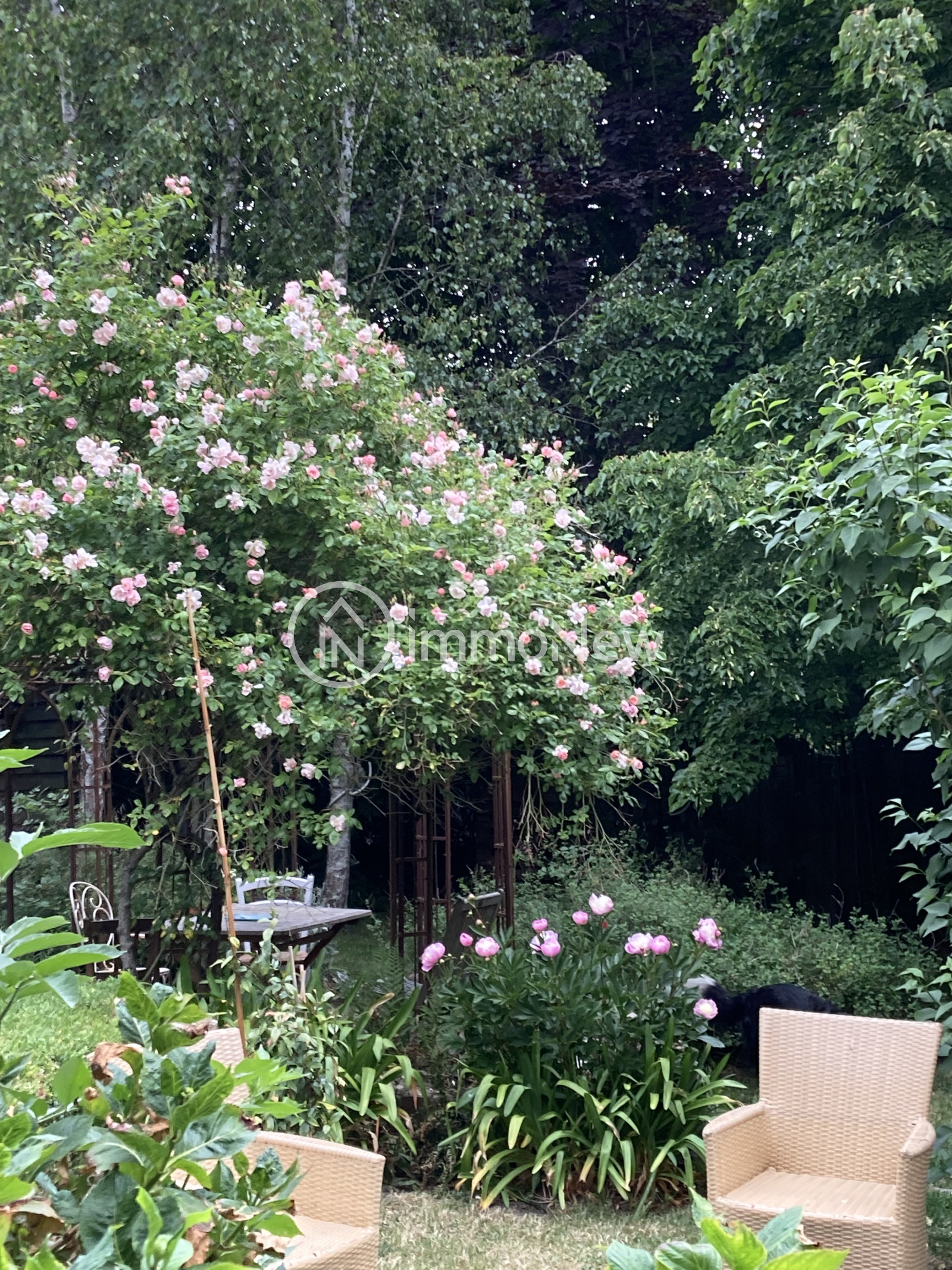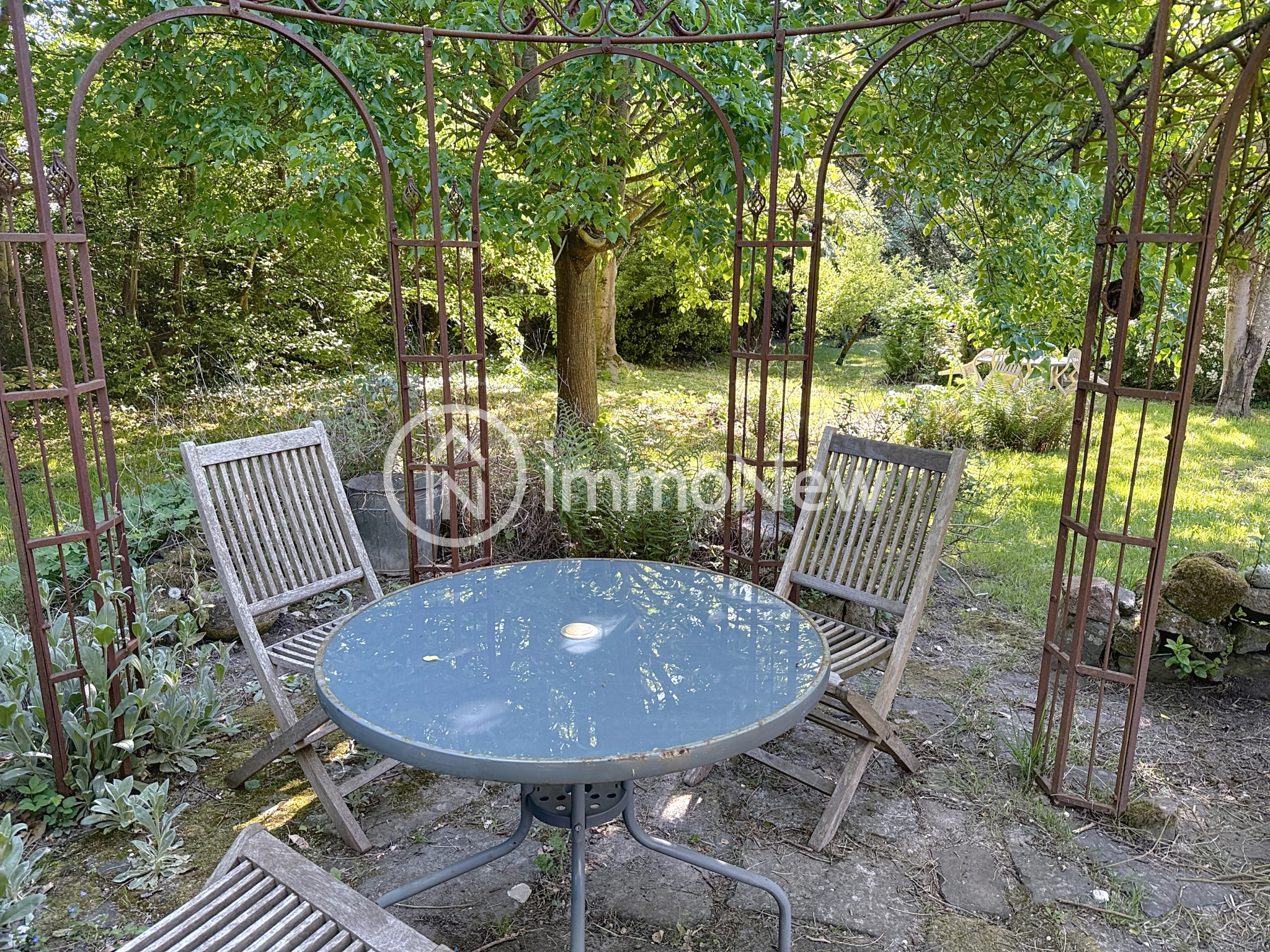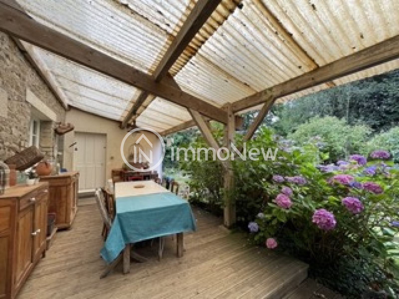 Terrasse couverte donnant sur jardin.
