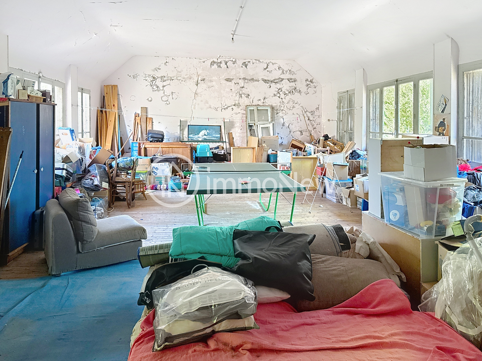 Au premier étage: palier, 3 chambres, salle de bains, bureau, wc, grande pièce aménageable de 74 m², anciennes douches.