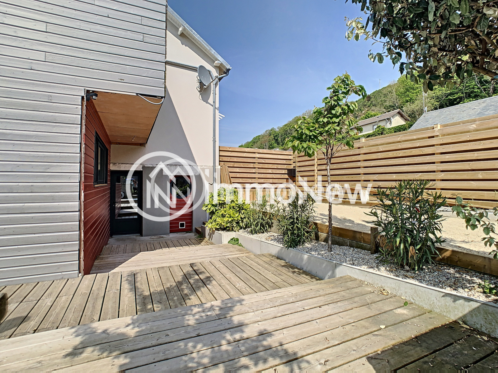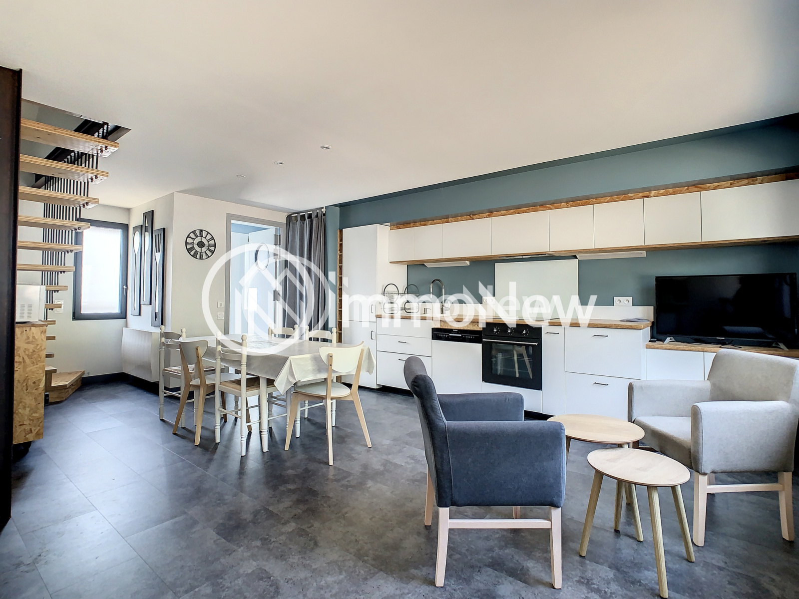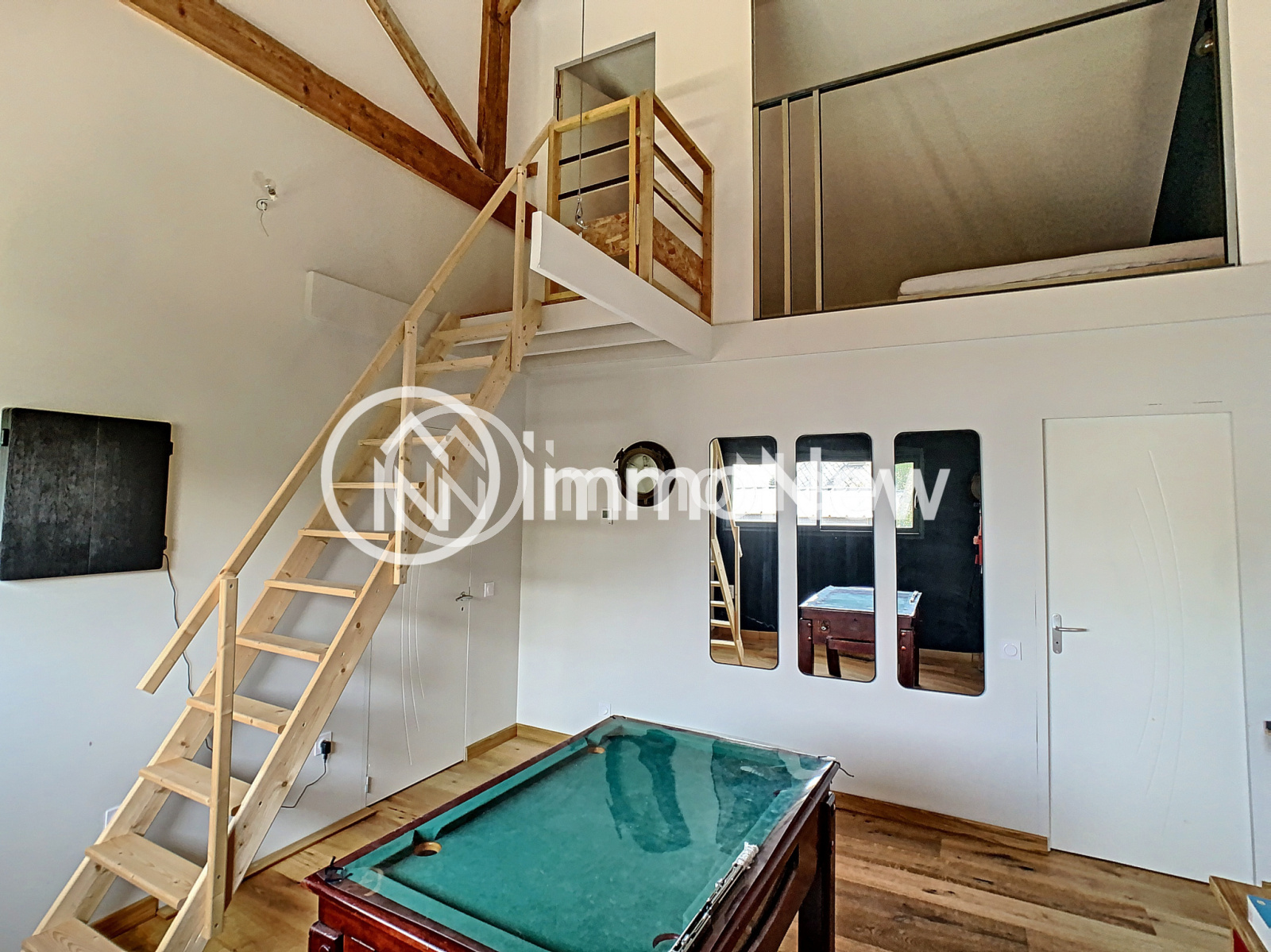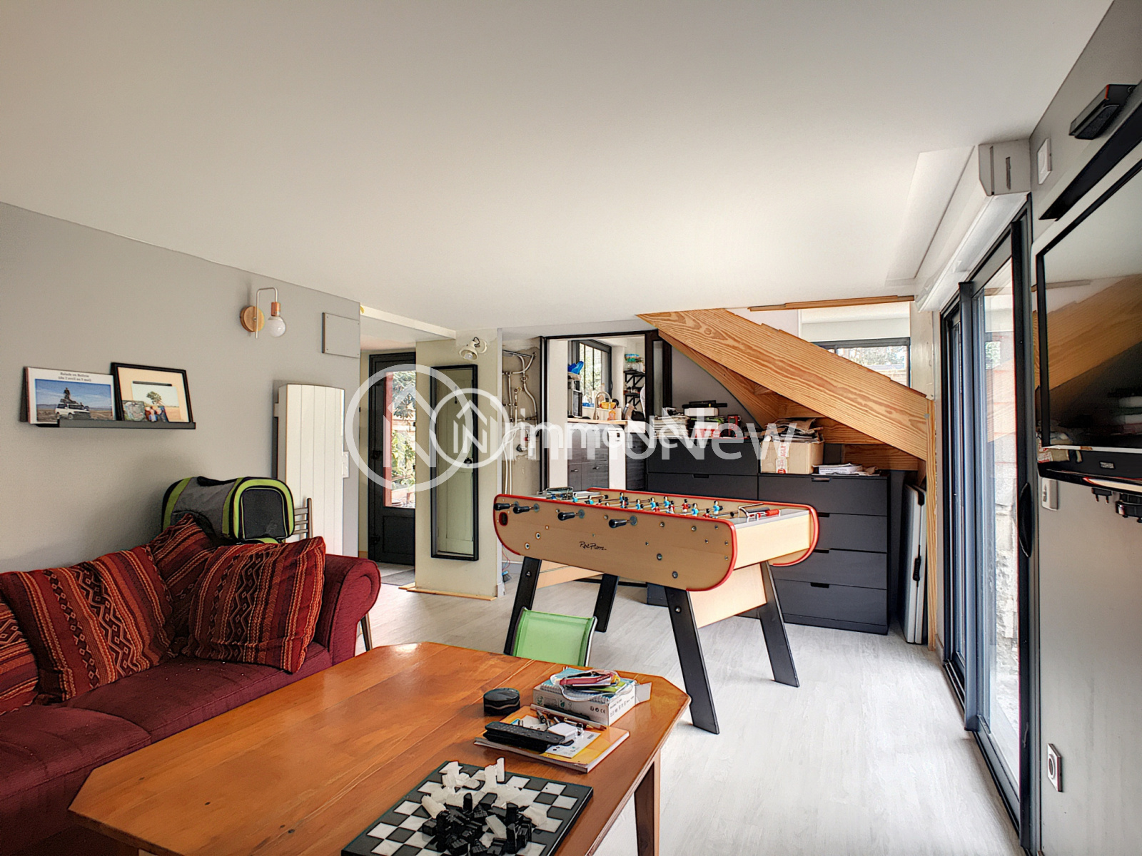 L'appartement, avec accès depuis sa terrasse privative ou communiquant de l'interieur, présente une belle pièce de vie de 28 m2, avec salle d'eau et wc avec au dessus deux chambres sous mansardes et wc..Terrain de 570 m2.