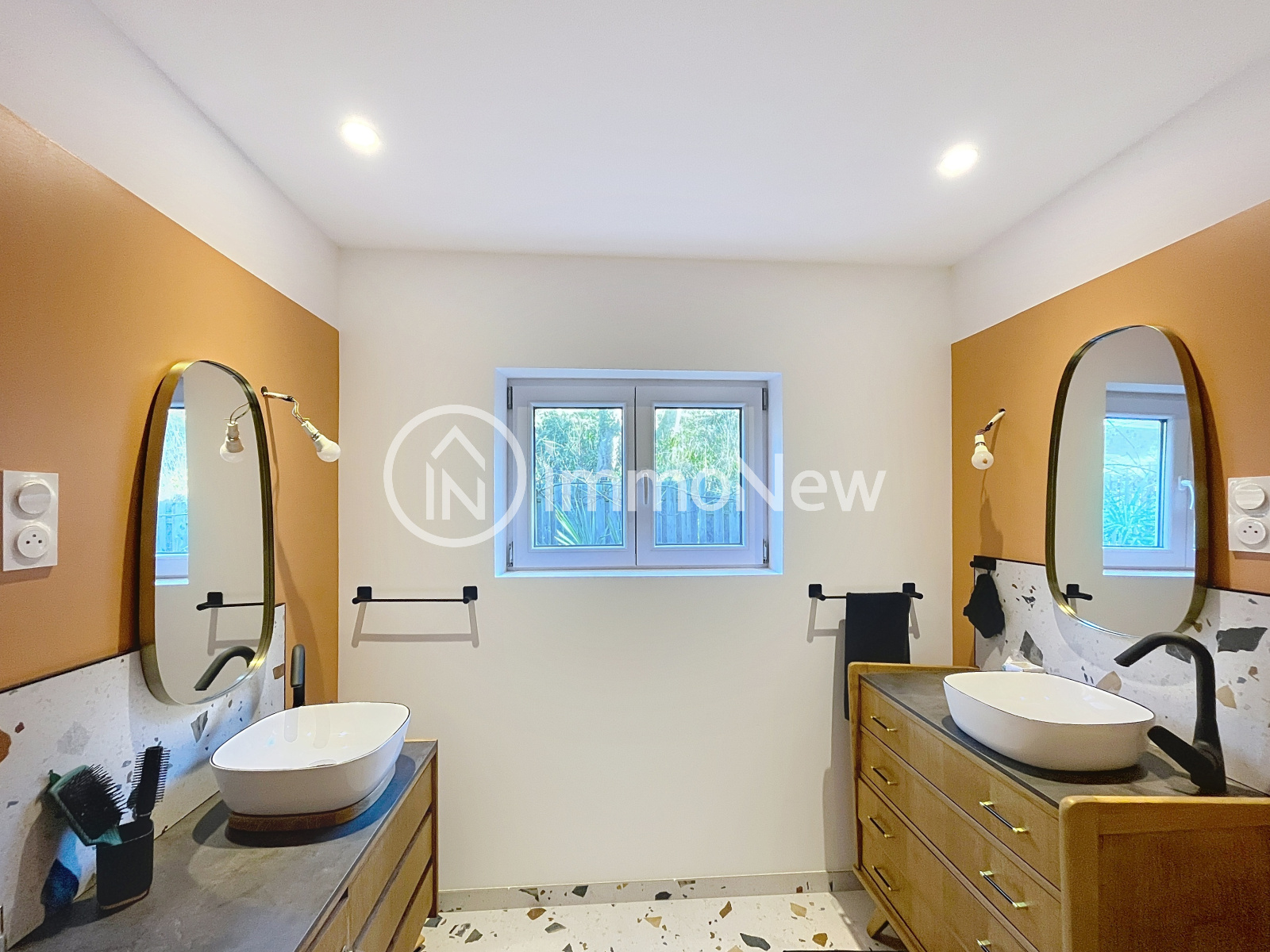 au rez-de-chaussée : une cuisine aménagée et équipée ouverte sur un séjour/salon avec accès sur la terrasse orientée à l'Ouest, trois chambres dont une avec accès à une terrasse privée et une salle d'eau extérieure, une salle d'eau avec doucle vasques et un wc.
