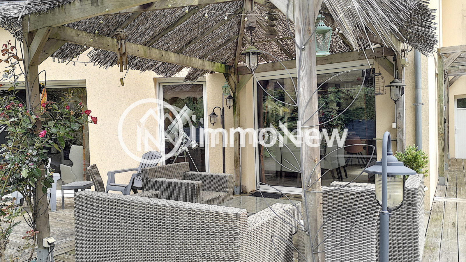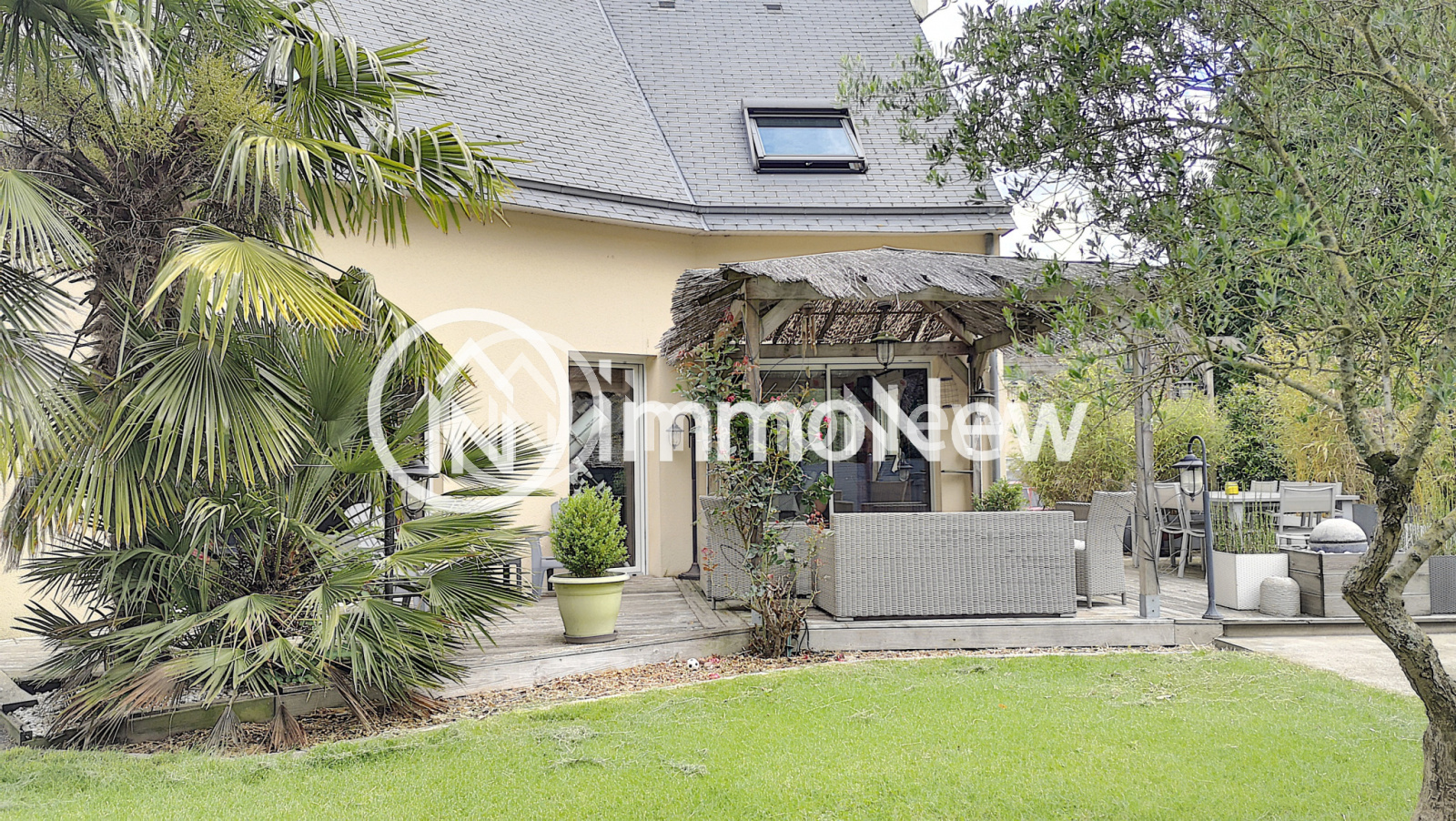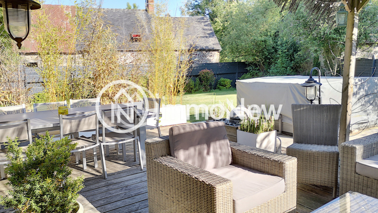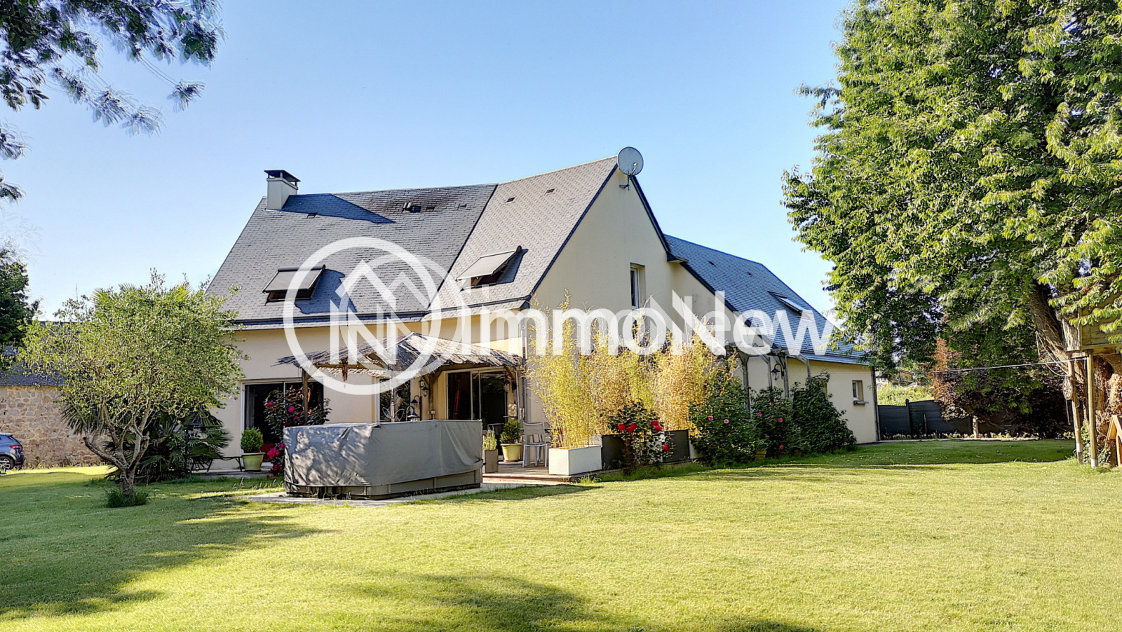 A L'Exterieur : Parking, allées en enrobé, magnifique jardin clos, fleuri, terrasse à l'est et terrasse avec jaccuzi 5 places expo sud, pergola / paillotte, Terrain de pétanque, Puits, Abri de jardin, un cerisier et sa cabane pour la joie des enfants.