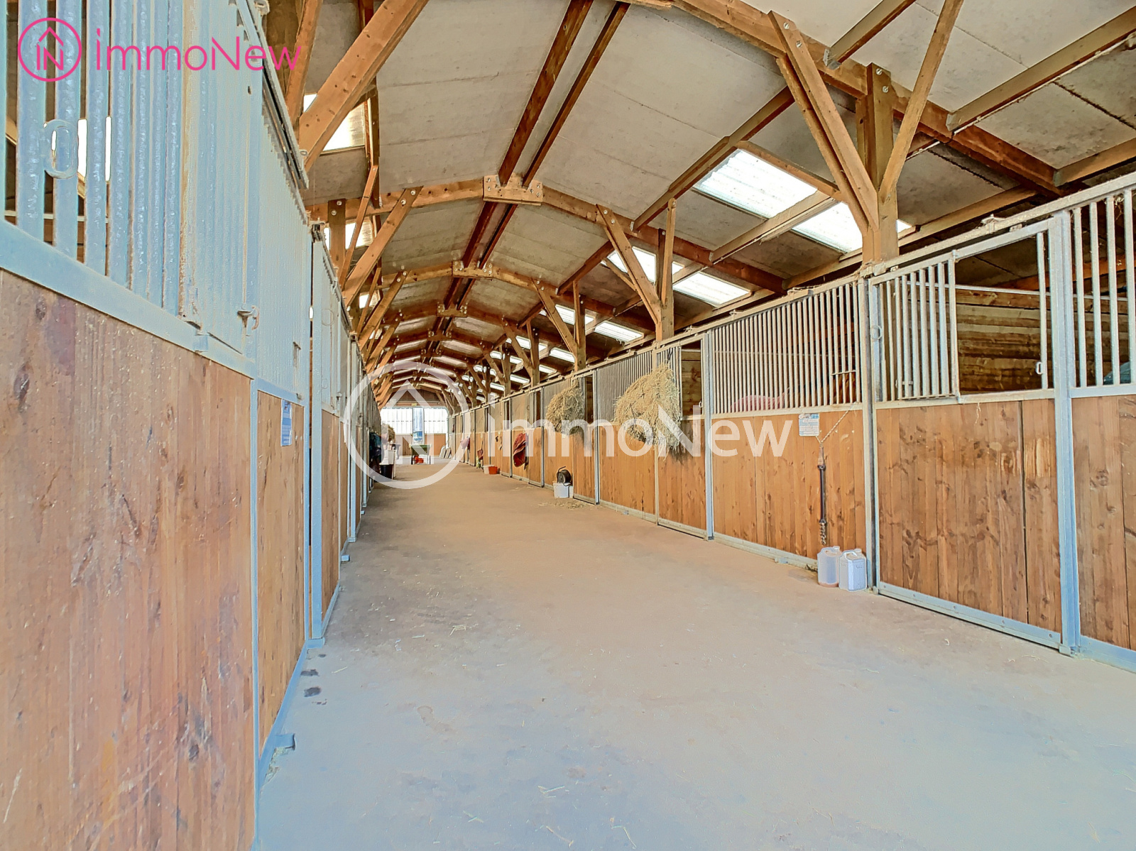 - Un grand bâtiment abritant le fourage avec espace sellerie, douche et espace point d'eau