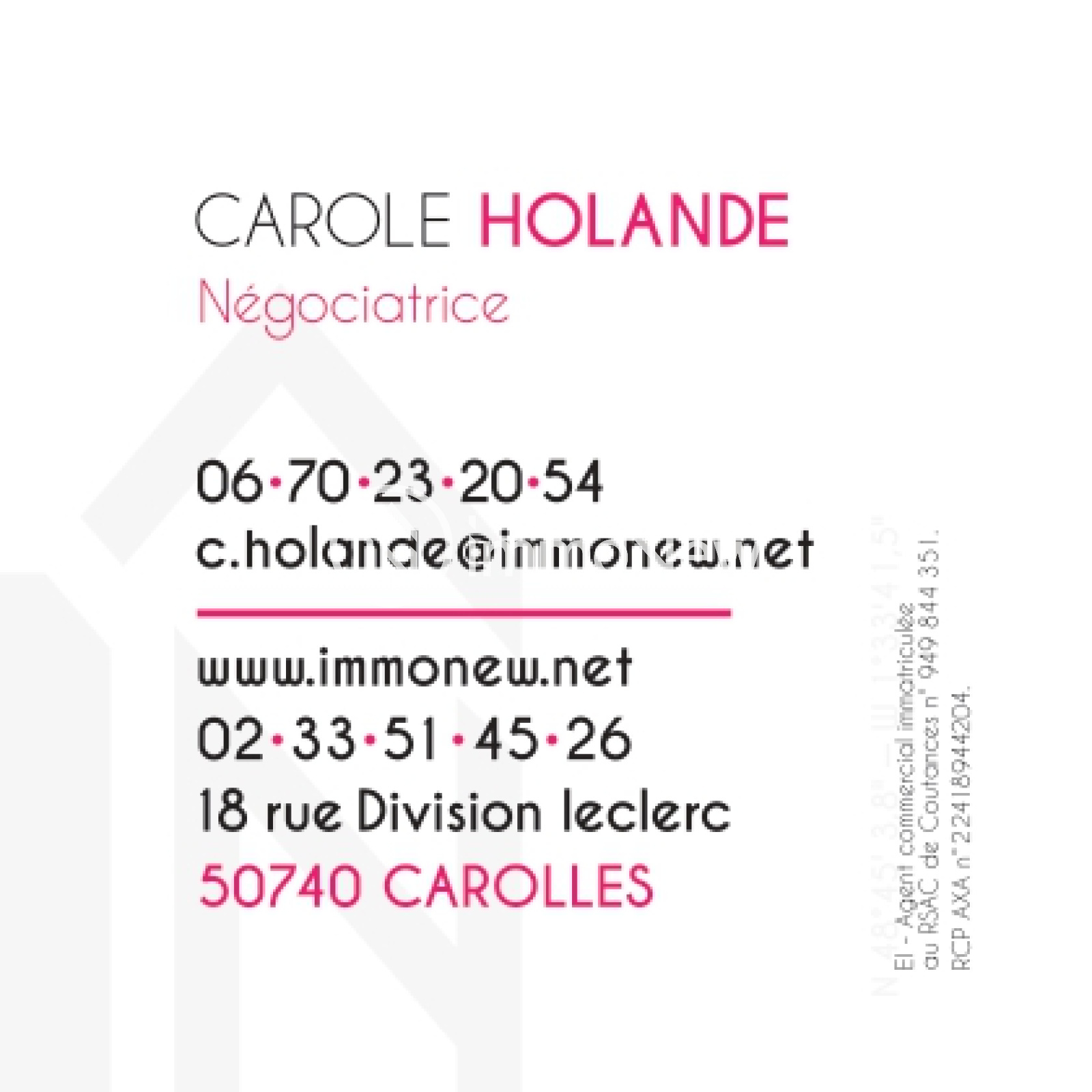 Vous souhaitez plus d’informations ou organiser une visite? Contactez dès maintenant EI Carole HOLANDE au 06 70 23 20 54, e-mail c.holande@immonew.net, agent commercial en immobilier immatriculée au RSAC de Coutances sous le numéro 949844351.