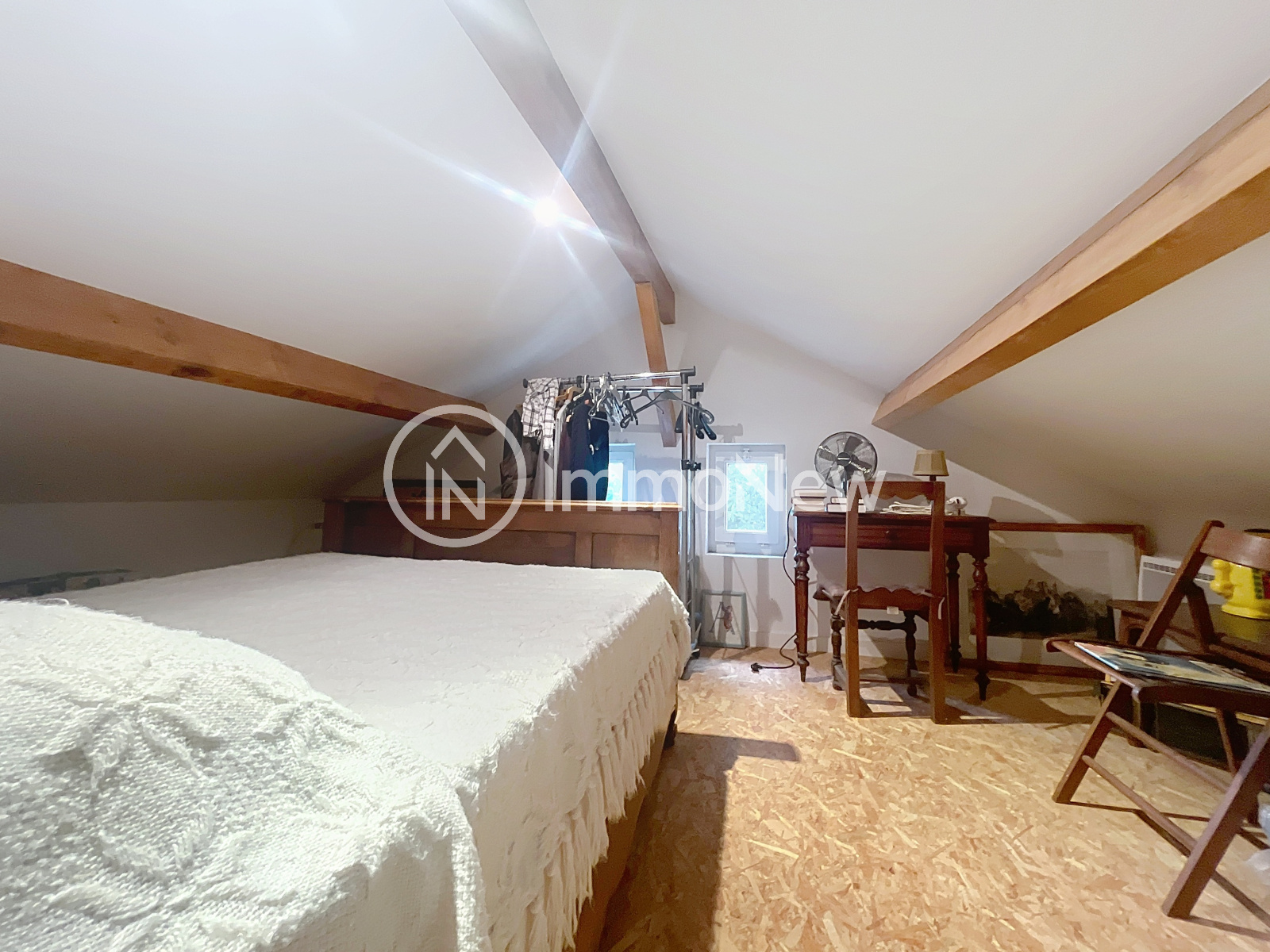 au rez-de-chaussée : une entrée, une cuisine, un séjour/salon avec poele à bois, un espace chambre, une salle de bains avec wc.