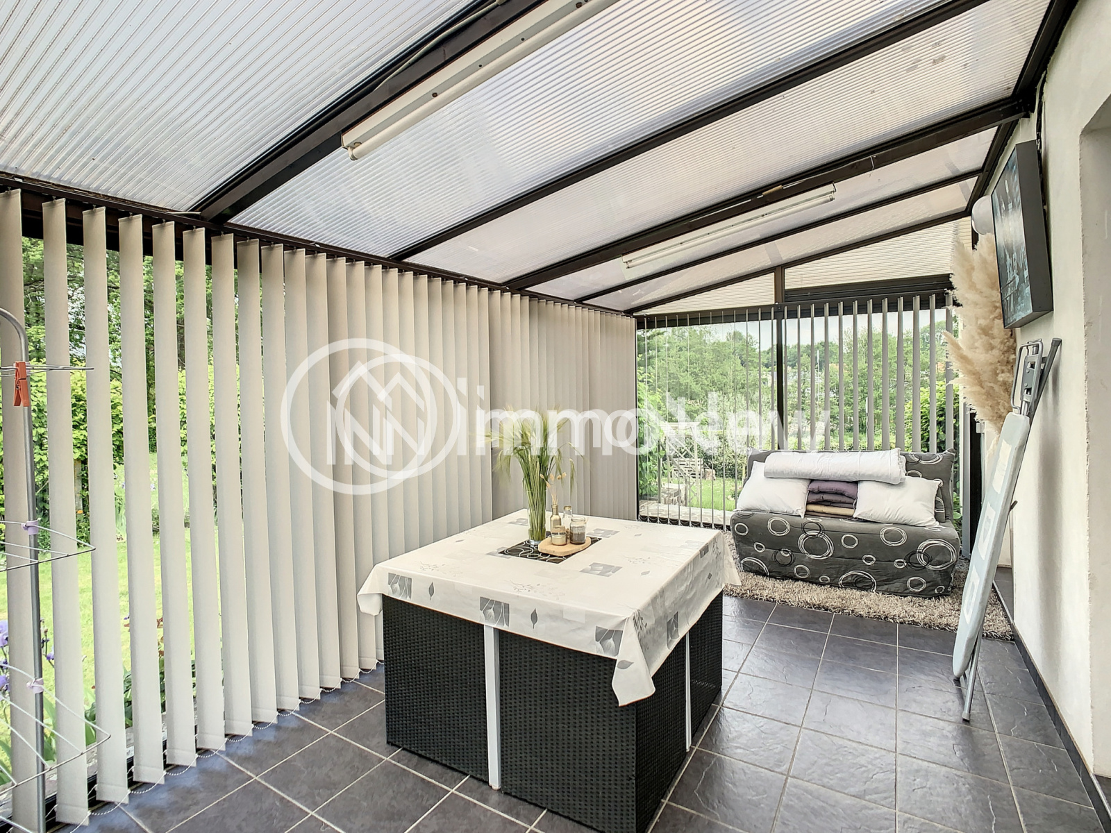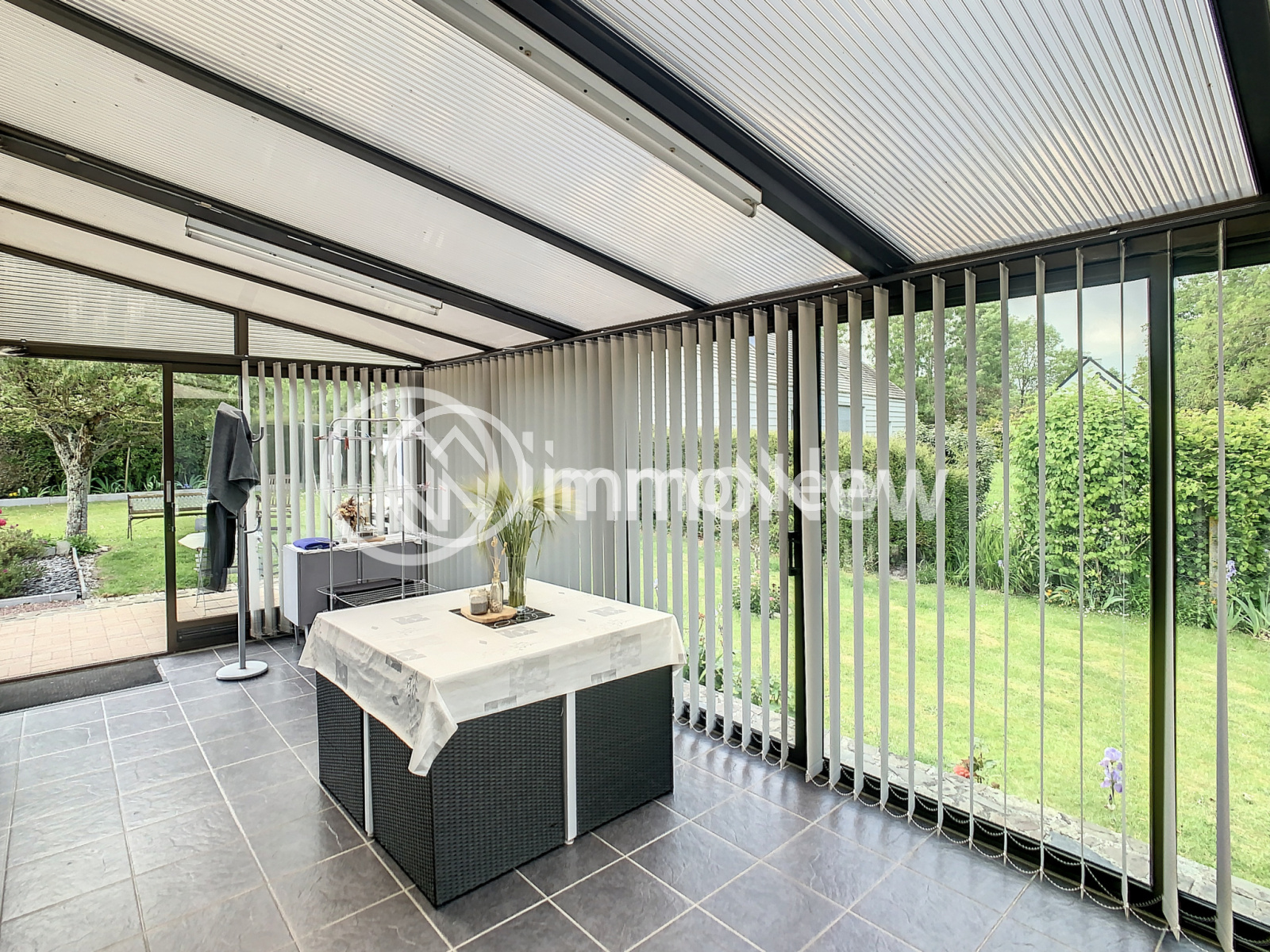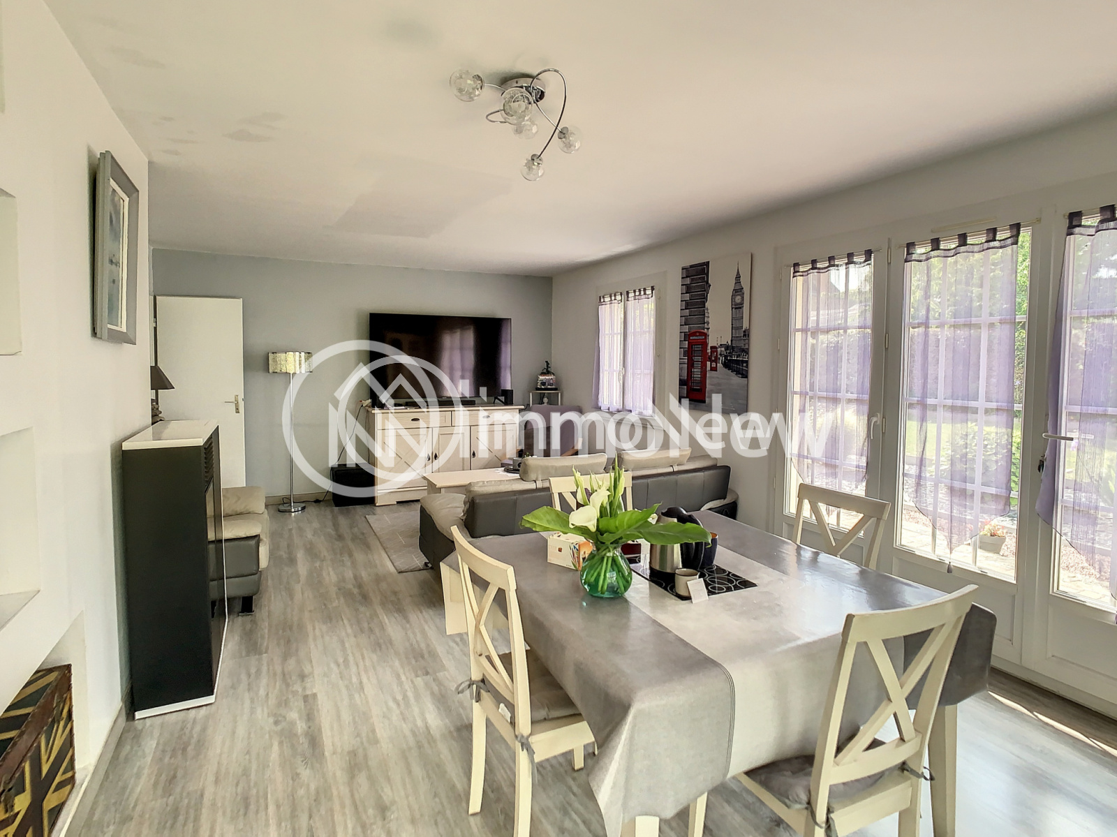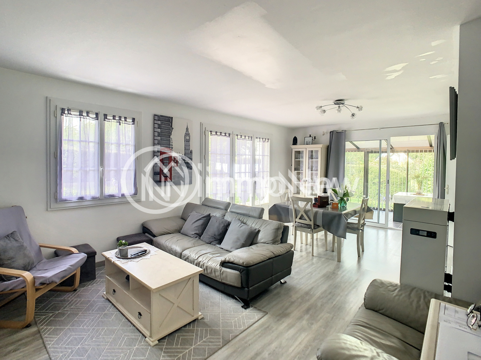 Un séjour/salon avec poêle à pellets, une cuisine séparée, trois chambres, une salle d'eau, une véranda et un wc.