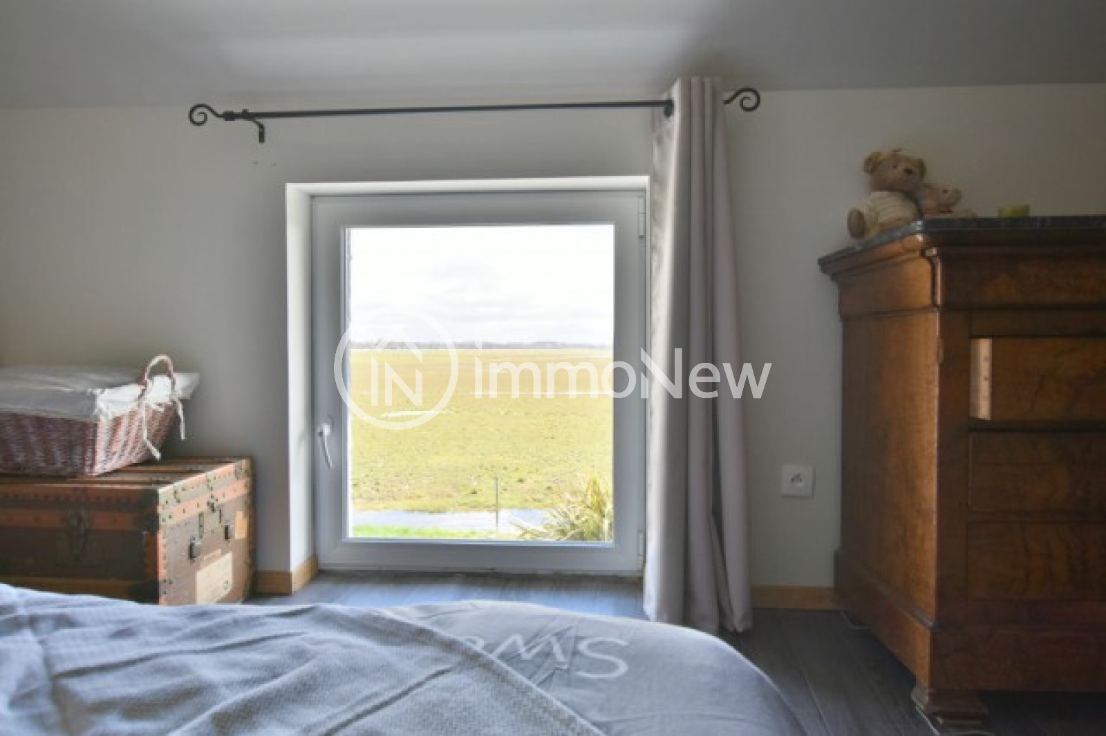 Vains (50300)Charmante longère, entièrement rénovée, face à la grève comprenant : Un séjour avec cheminée et poële à bois, un salon, une cuisine équipée aménagée, une salle d'eau avec WC, un garage attenant avec lingerie et buanderie, A l'étage : 4 chambres dont une grande de 30m², une salle de bains, un WC, des placards sur le palier, Grenier aménageable au dessus. Jardin arboré