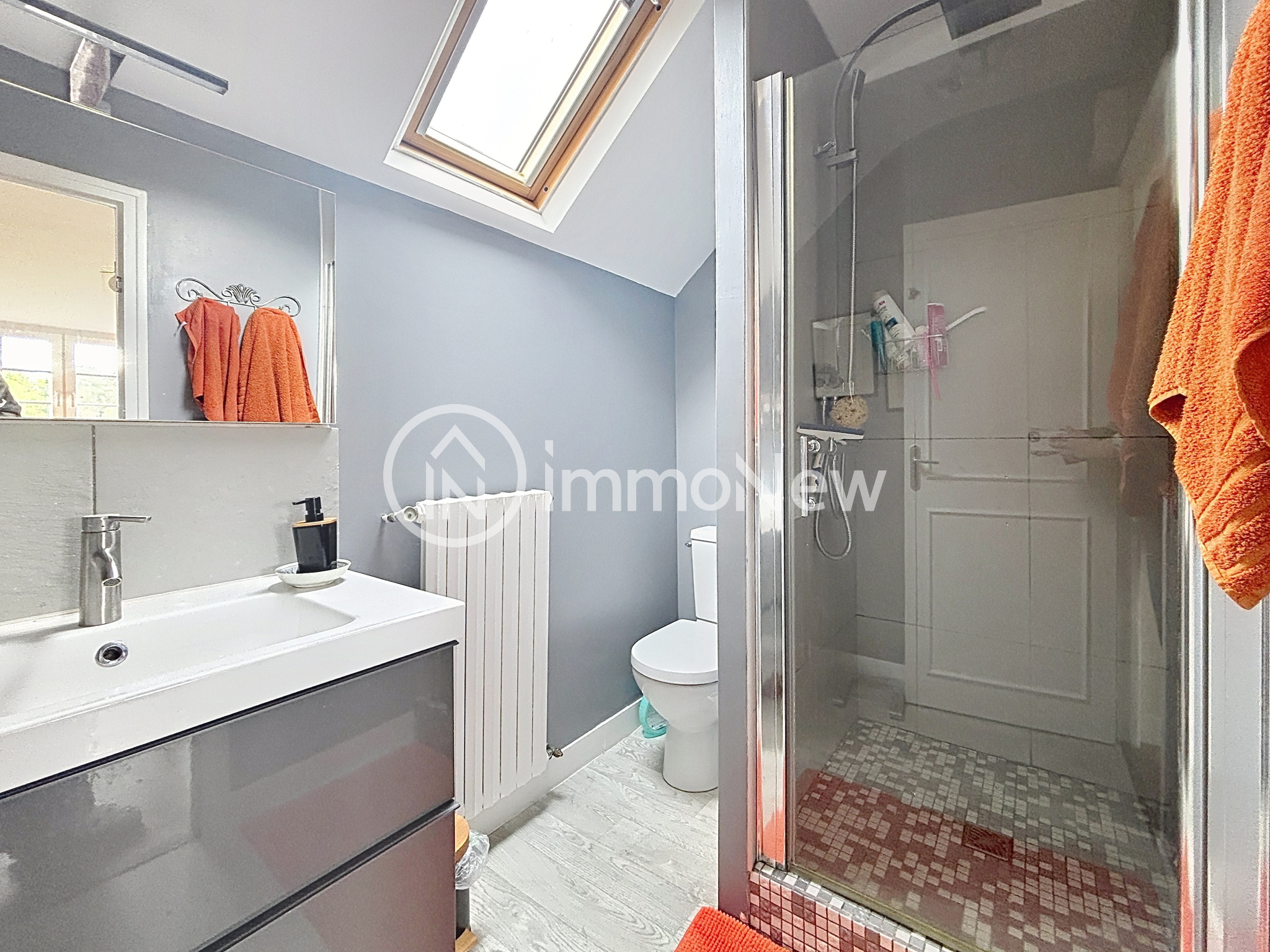 À l’étage, une petite mezzanine dessert deux chambres avec accès aux combles, ainsi qu’une salle d’eau avec WC, idéale pour l’espace nuit.