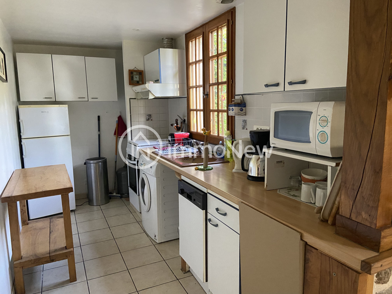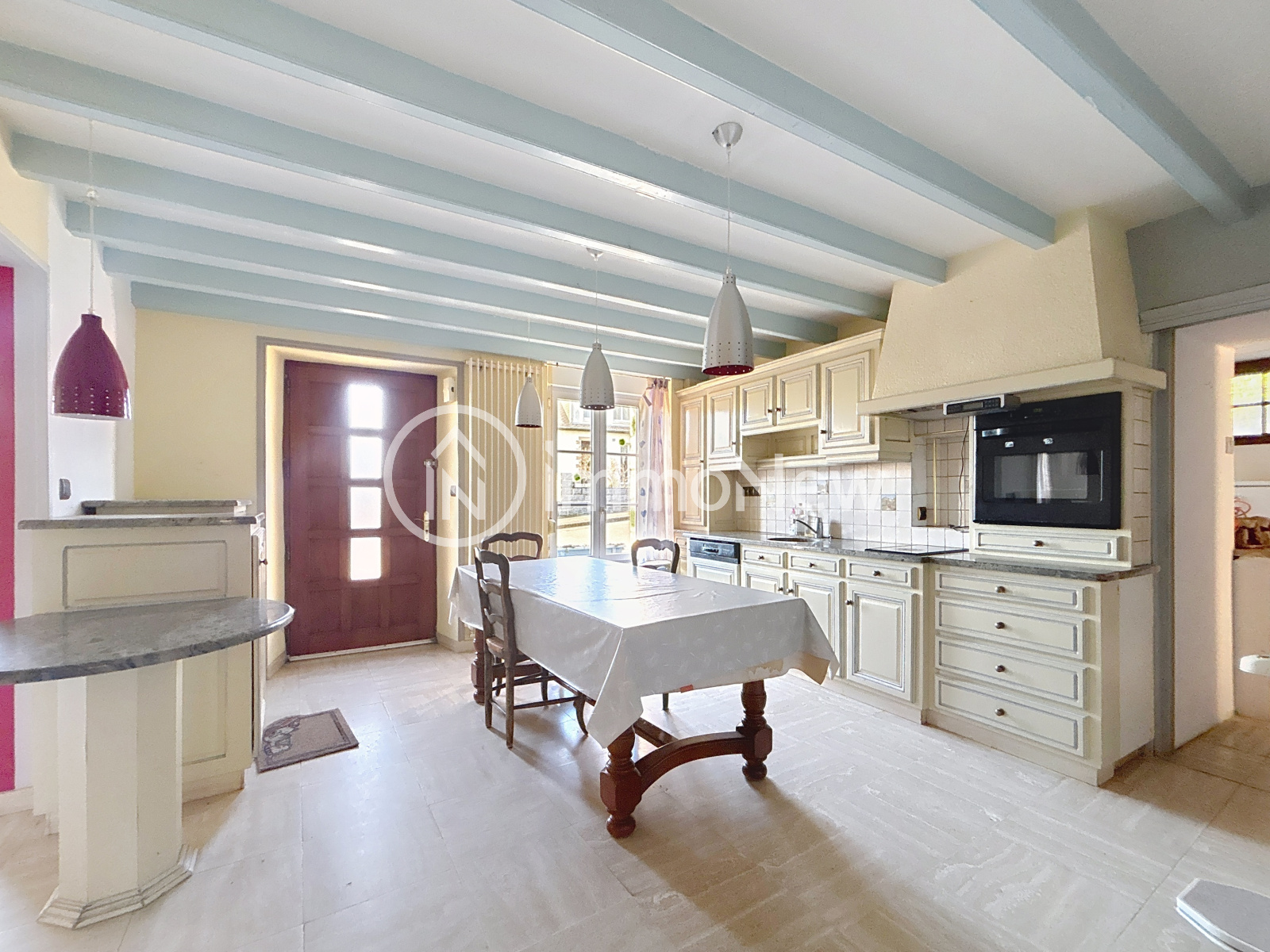 Une cuisine ouverte sur le salon, agrémentée d’un insert à bois et d’un petit four à pain, apportant authenticité et convivialité